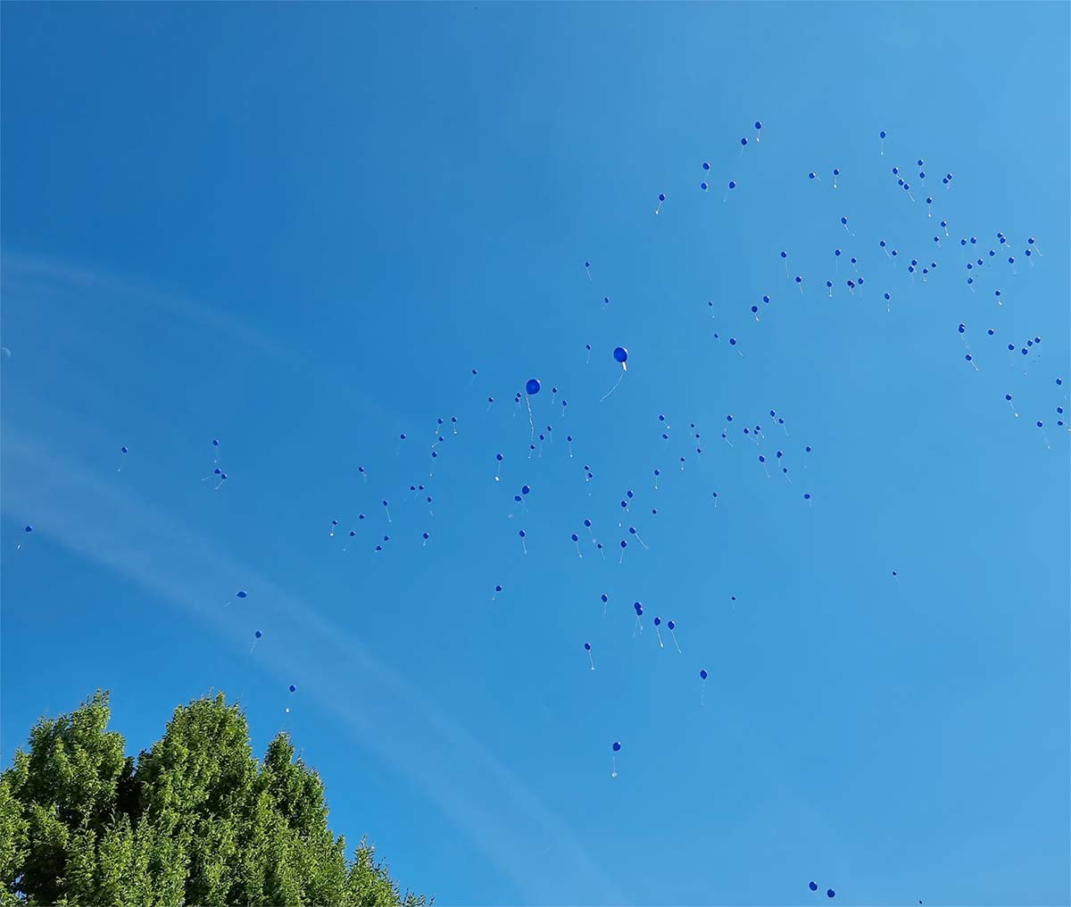 Zum Abschluss versammelten sich alle Kinder und Erwachsenen auf dem Pausenhof, um gemeinsam blaue Bohni-Luftballons steigen zu lassen.