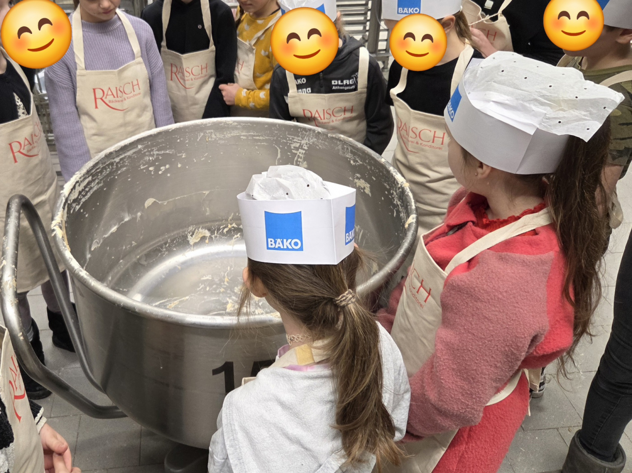 Dort erhielten wir zunächst die richtige Arbeitskleidung und anschließend eine ausführliche Backstubenführung. Dabei konnten die Kinder aus direkter Nähe die Arbeit in der Produktion bestaunen, Fragen stellen und sich einen Überblick über die vielseitigen Aufgaben in einer Bäckerei verschaffen. Sogar die riesigen Maschinen, die massiven Kühlschränke und großen Backöfen konnten wir uns genauer ansehen.